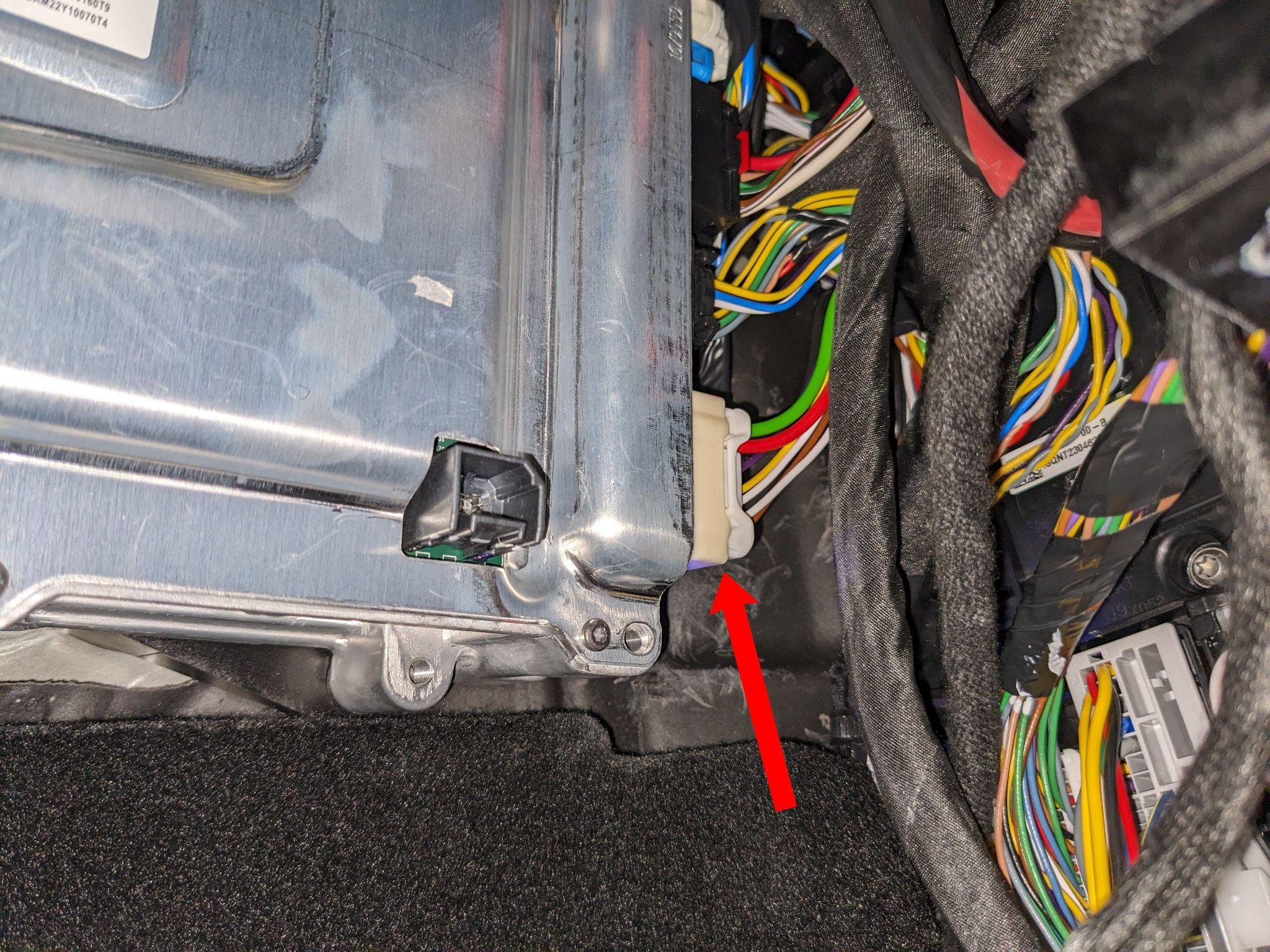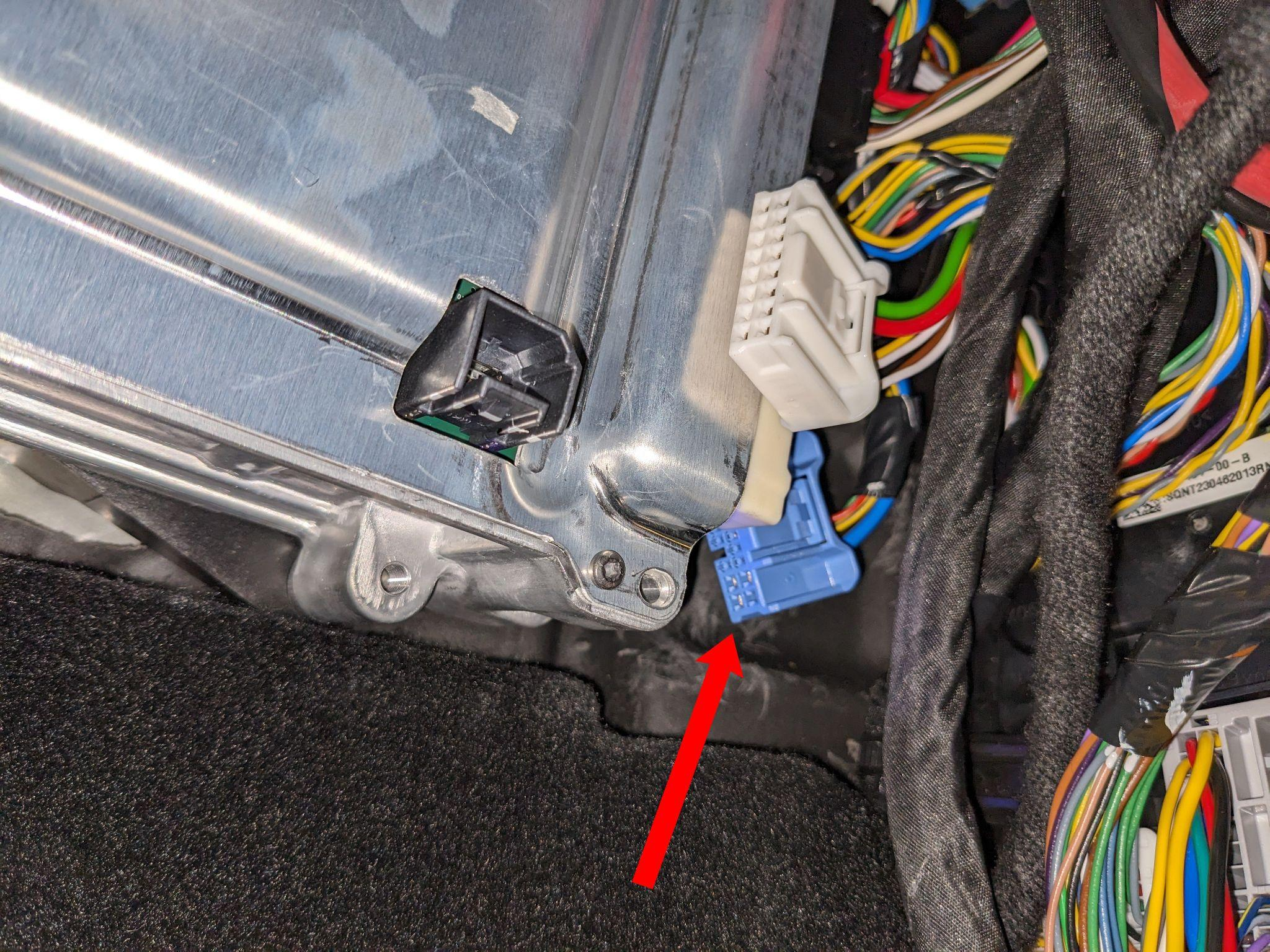 Most már látható az autopilot számítógép. A hátul lévő kék csatlakozó eléréséhez először a fehér csatlakozót kell eltávolítani. Mindkét csatlakozónál a fület le kell nyomni az eltávolításhoz.